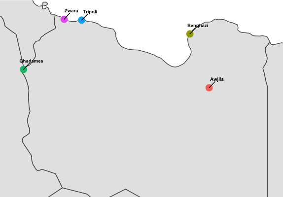 Given how few people currently work on Libyan languages, it’s unsurprising that there are only a few locations in Libya which have been the subject of linguistic studies. Below is a map with the locations which have had a book-length linguistic study in the past 50 years. Each point on the map corresponds to only one book.