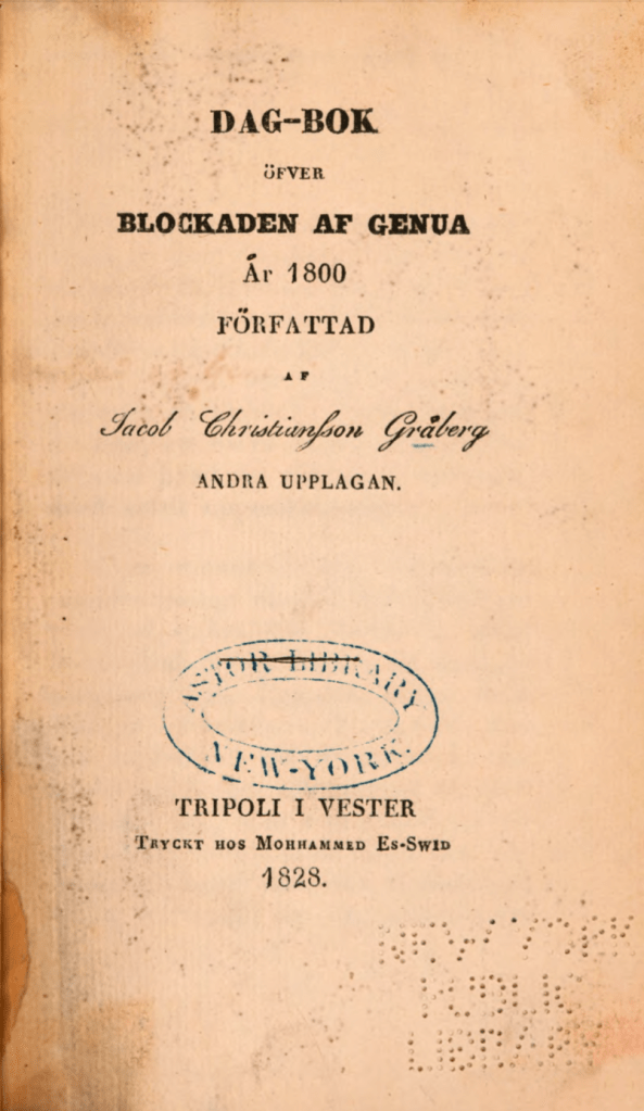 Thanks to a social media post by Baddredin Mukhtar I came across a source previously unknown to me: the Swedish diplomat Jacob Gråberg’s eyewitness account of the Austrian siege of French-occupied Genoa in 1800. Apparently published in Tripoli in 1828, it is certainly one of the oldest books printed in Libya. Though it is quite hard to know if it is the oldest, it is, as Mukhtar proposes, so far the oldest we have a clear evidence for.